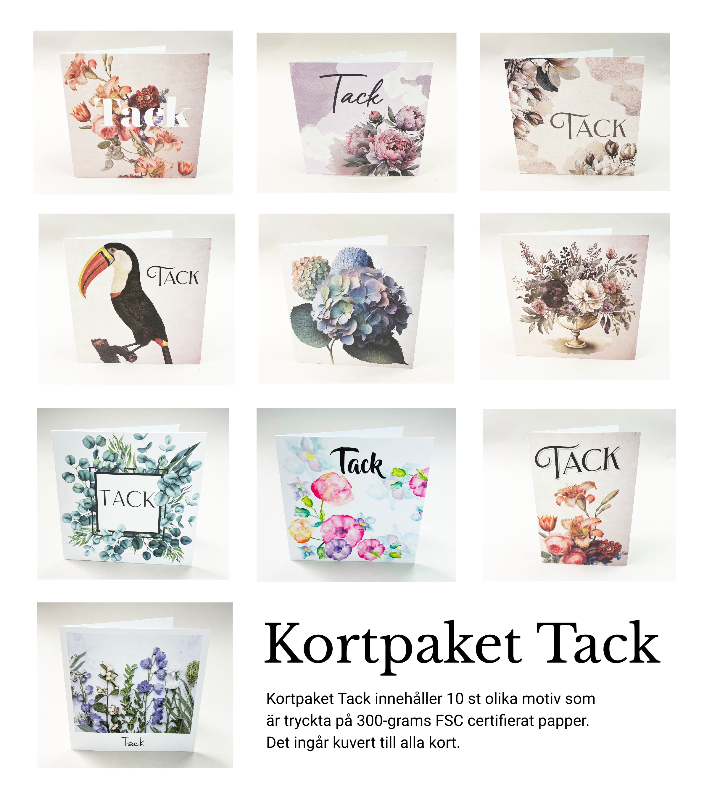 Upptäck vårt breda sortiment av färdiga tackkort, perfekta för att uttrycka din tacksamhet vid alla tillfällen. Oavsett om det gäller födelsedag, dop, konfirmation, begravning eller andra tillfällen, har vi kort som passar just din anledning. Våra tackkort är designade med omtanke och finns i flera stilrena och vackra motiv, så att du enkelt kan skicka ett varmt och personligt tack. Kombinera enkelhet med elegans och gör din hälsning minnesvärd!