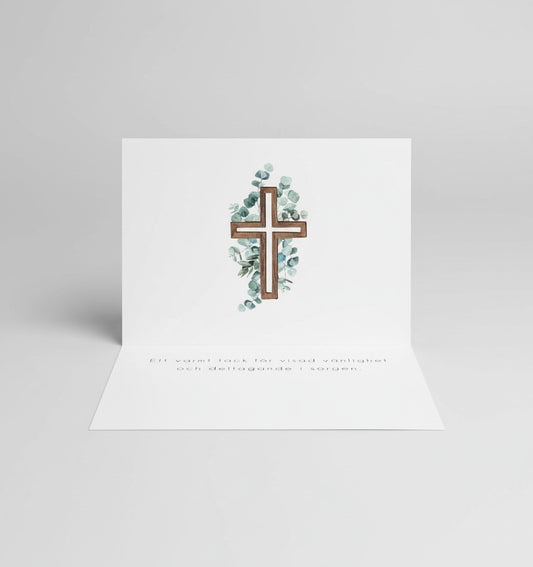 Färdiga tackkort till efter begravningen med motiv av eucalyptus på kors i akvarell. 10 kort inklusive kuvert.