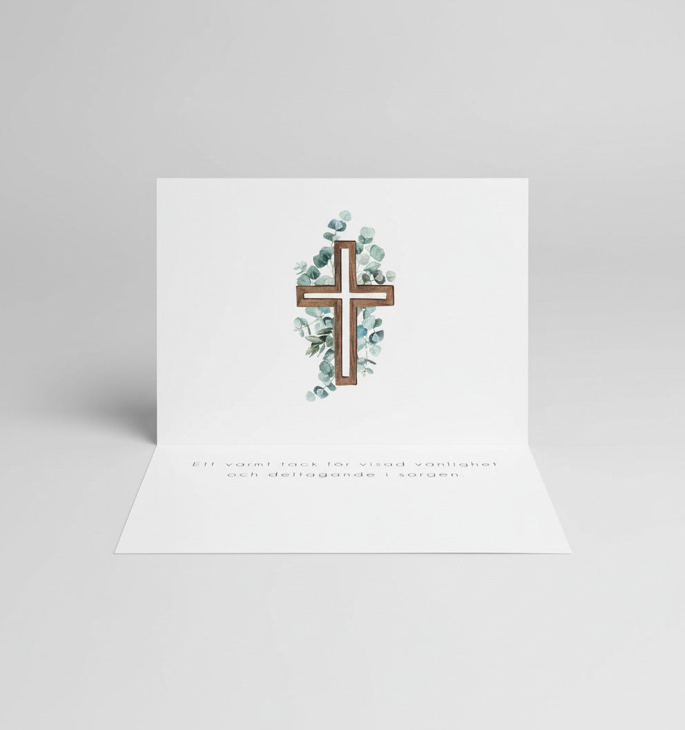 Visa din uppskattning med dessa färdiga tackkort till efter begravningen, elegant illustrerade med eucalyptus på kors i akvarell – en symbol för frid, tro och minne.