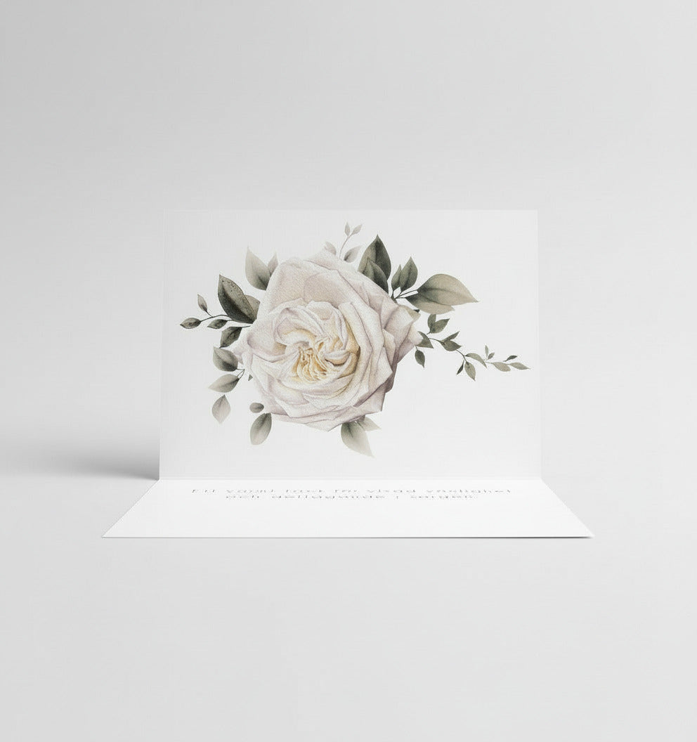 Visa din tacksamhet med dessa färdiga tackkort till efter begravningen, vars motiv av en vit ros i akvarell symboliserar minne, respekt och evig kärlek.