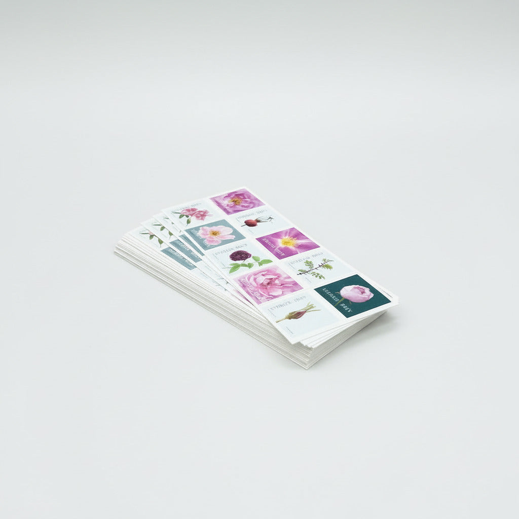 Häfte med 10st självhäftande frimärken med motivet rosor – Enligt PostNords aktuella portotabell