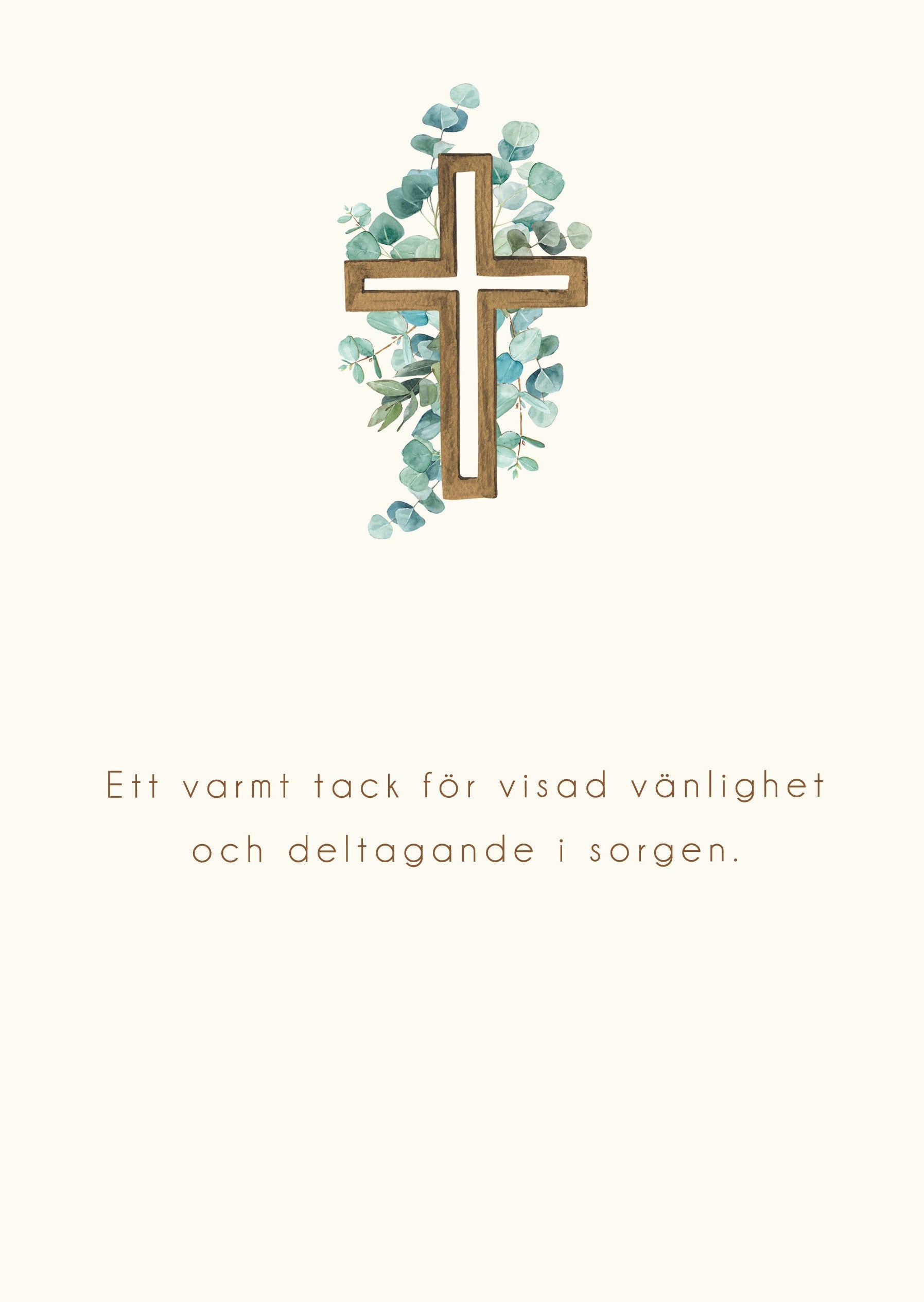 Vackert tackkort med en elegant design av ett träkors som ligger på en bädd av gröna eucalyptusblad. På framsidan står det "Ett varmt Tack" i stilren, handskriven stil. Perfekt att använda för att visa din uppskattning och omtanke efter en begravning eller för att uttrycka din tacksamhet på ett fint och personligt sätt. Det medföljande kuvertet är prydligt och passar till kortets eleganta design.